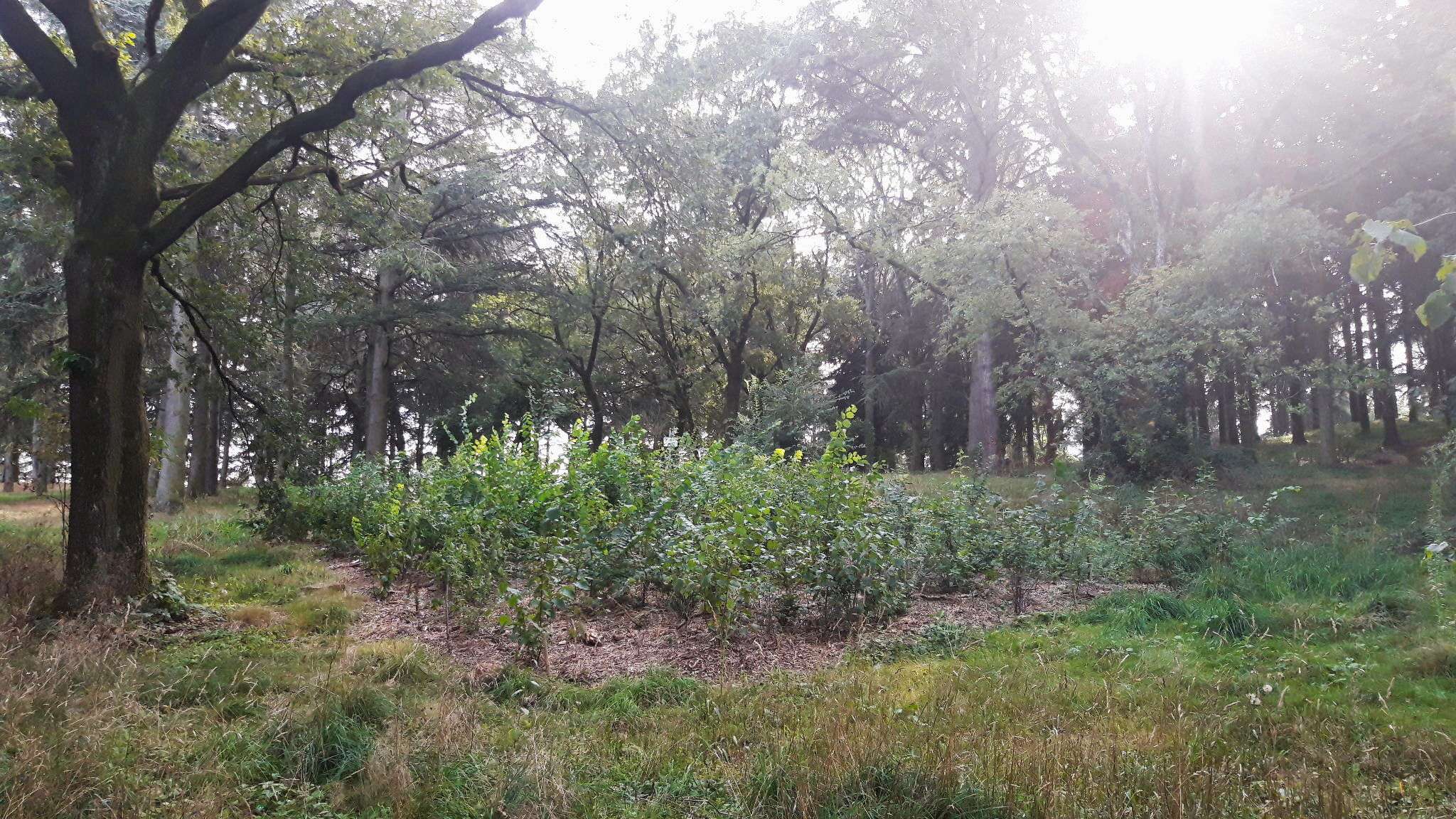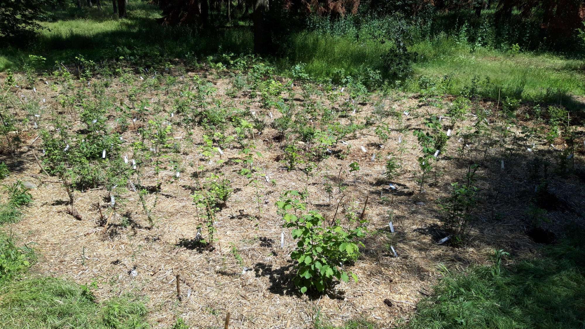 Riche de 30 espèces végétales locales (liste ci-dessous) et mesurant 200m², cette plantation a été réalisée avec la participation d’environ 120 bénévoles, y compris une classe de primaire. Elle fait l’objet d’un suivi régulier qui va s’intensifier en 2024 (densité, relevés de biodiversité, croissance…). La densité de 3 arbres par m² s’y est maintenue et la large majorité des plants ont survécu aux phases de gels et de sècheresse. Les plus hauts ormes dépassent les 4m, moins de 3 ans après leur mise en place.