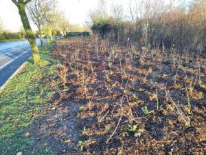 La plantation a pris place sur une pelouse située entre une rangée d’arbres d’alignements côté route, et un massif d’arbres et arbustes spontanés côté est. Le sol a été retourné et enrichi par les soins du département avant la plantation.