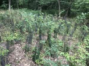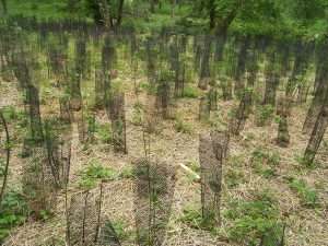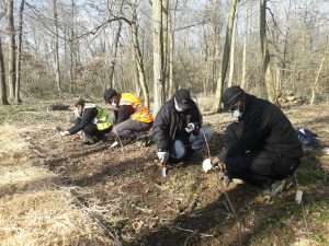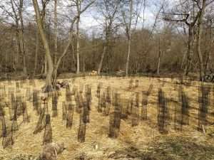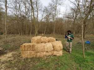 Première opération après la plantation : les volontaires présents durant la plantation reviennent sur site pour installer des gaines biodégradables pour protéger les plants d’éventuels rongeurs. La plantation se situe dans un bois juste en face d’installations de maraîchers, et on aperçoit des lapins baladeurs de temps à autre… Vite !