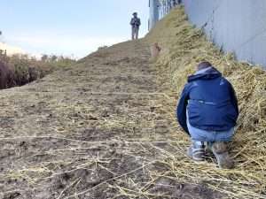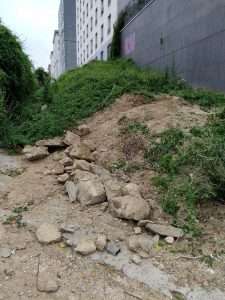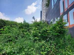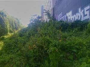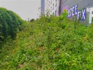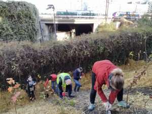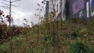 La plantation se situe au bout d’une langue de terre, entre une grille d’un dépôt de la SNCF et des logements. Des lianes recouvraient la grille avant la plantation, et nous avons choisi de ne pas les retirer afin de ne pas perturber les nombreux oiseaux qui y nichent chaque année. Ce choix a eu des impacts sur le suivi du site, qui a dû être fréquent : les lianes proches présentaient une menace d’étouffement pour les jeunes arbres, vers lesquelles elles étendaient constamment leurs vrilles, comme on le constate sur les photos ci-dessous.