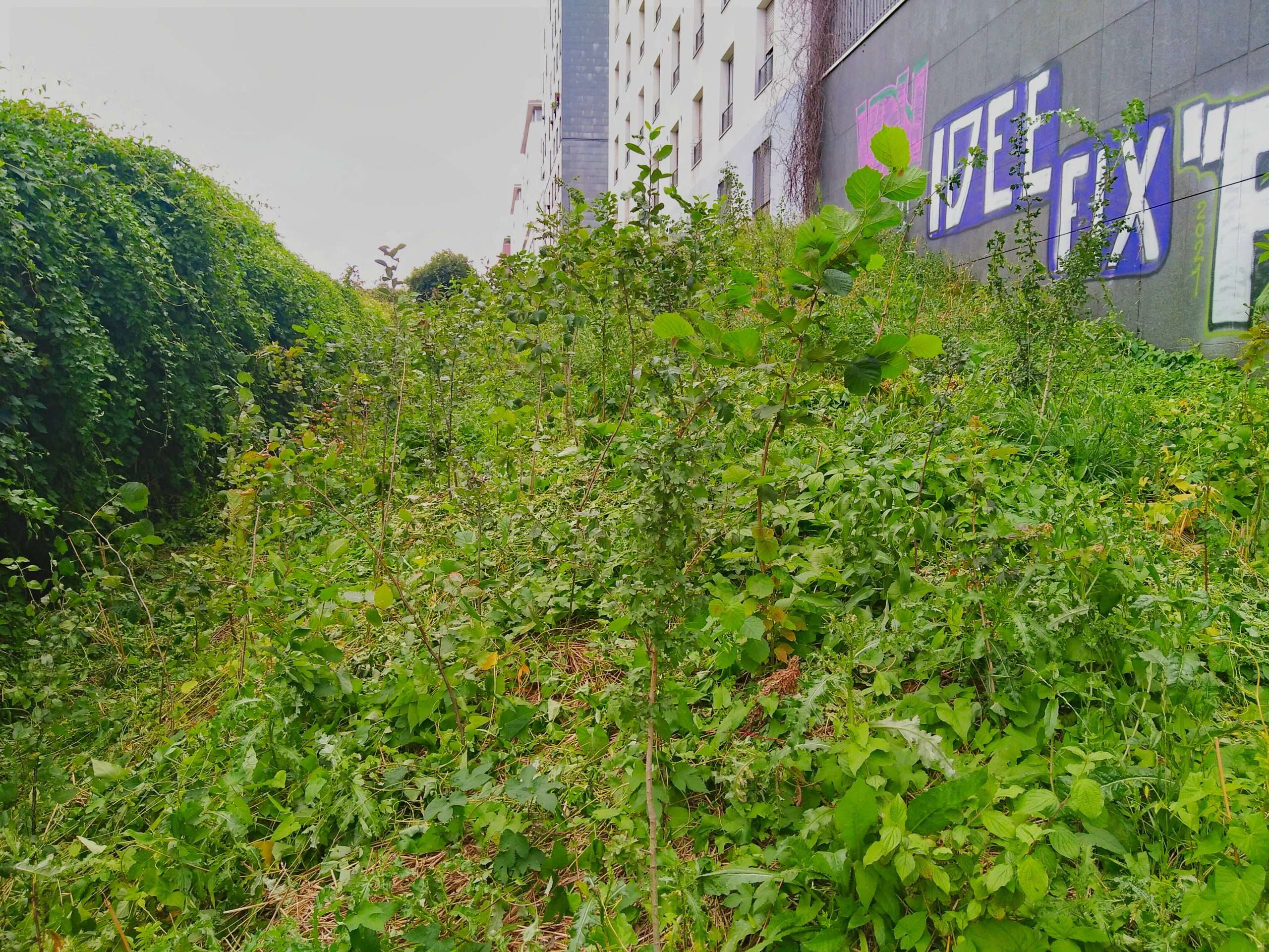La plantation se situe au bout d’une langue de terre, entre une grille d’un dépôt de la SNCF et des logements. Des lianes recouvraient la grille avant la plantation, et nous avons choisi de ne pas les retirer afin de ne pas perturber les nombreux oiseaux qui y nichent chaque année. Ce choix a eu des impacts sur le suivi du site, qui a dû être fréquent : les lianes proches présentaient une menace d’étouffement pour les jeunes arbres, vers lesquelles elles étendaient constamment leurs vrilles, comme on le constate sur les photos ci-dessous.